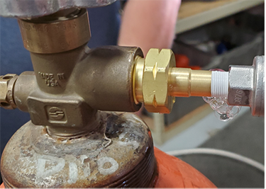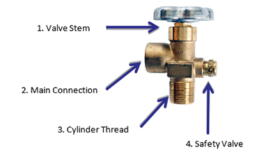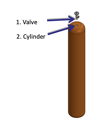 Aunque las fugas de SF₆ pueden producirse en cualquier punto del proceso de manejo del gas, en este artículo nos centraremos en la verificación de fugas en cilindros y analizaremos los puntos de fuga más comunes en un cilindro. Las fugas de SF₆ pueden ocurrir en varias áreas de la zona de la válvula del cilindro, como la válvula principal, la válvula de seguridad o la propia válvula del cilindro. Es importante revisar cada una de estas zonas al verificar la presencia de una fuga de SF₆. La Figura 1 a continuación muestra los puntos de fuga más comunes dentro de una válvula.